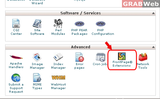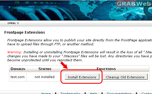 3) Click on "Install Extension" under "Functions" category in front of the domain under which you want to enable Frontpage.