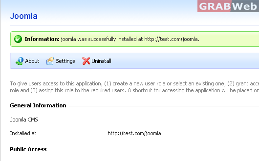 8) You will get the notice "Information: joomla was successfully installed at http://test.com/joomla."