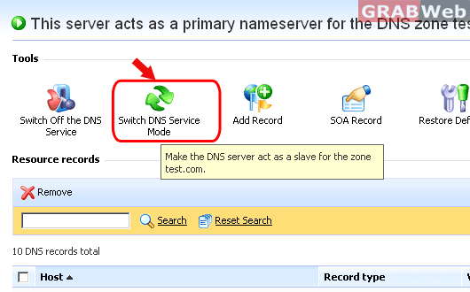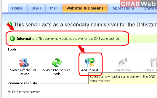 6) You will get a message above that this dns wil work as slave DNS. Click Add Record, specify the IP address of